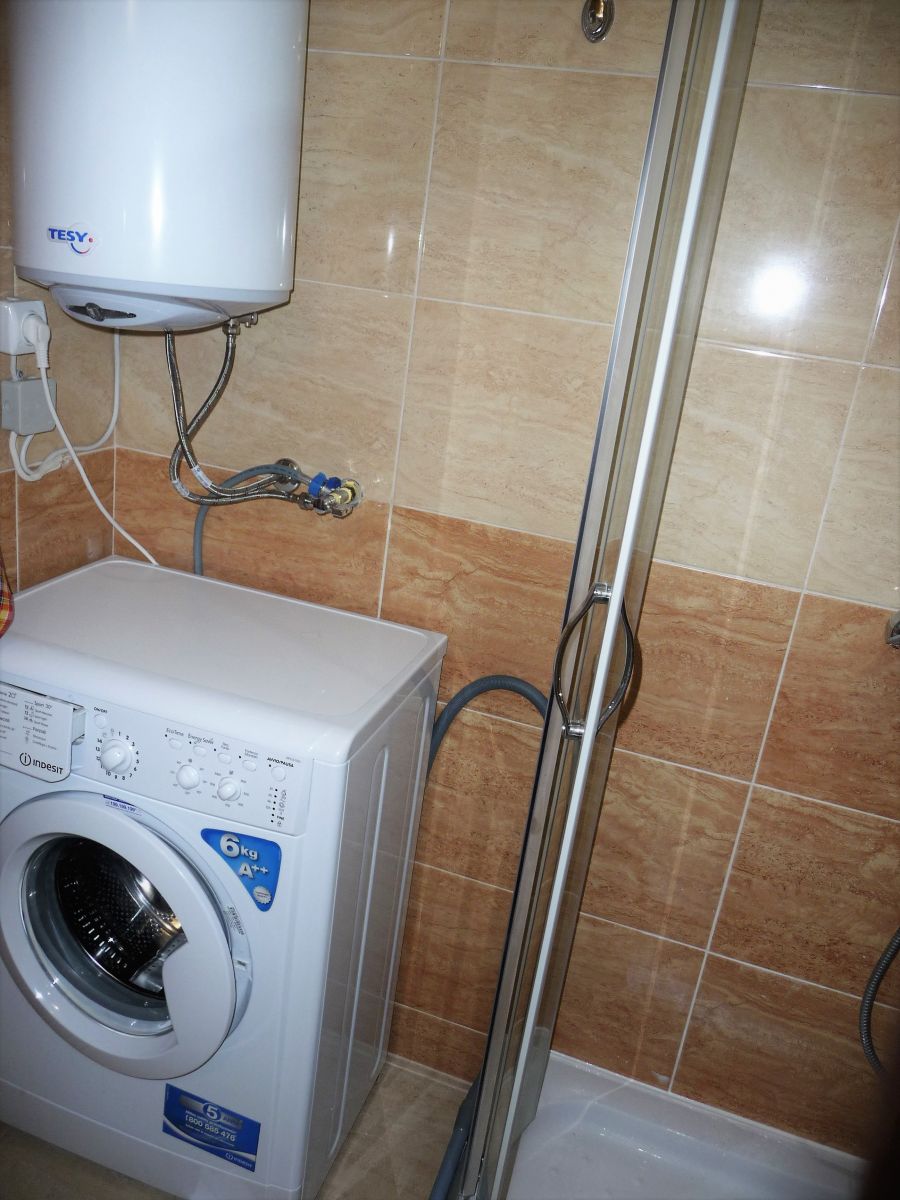 Санитарный узел : пол и стены плитка, стиральная машина, водонагреватель, душевая кабинка,мебель, полотенцесушитель,зеркало, этажерка.