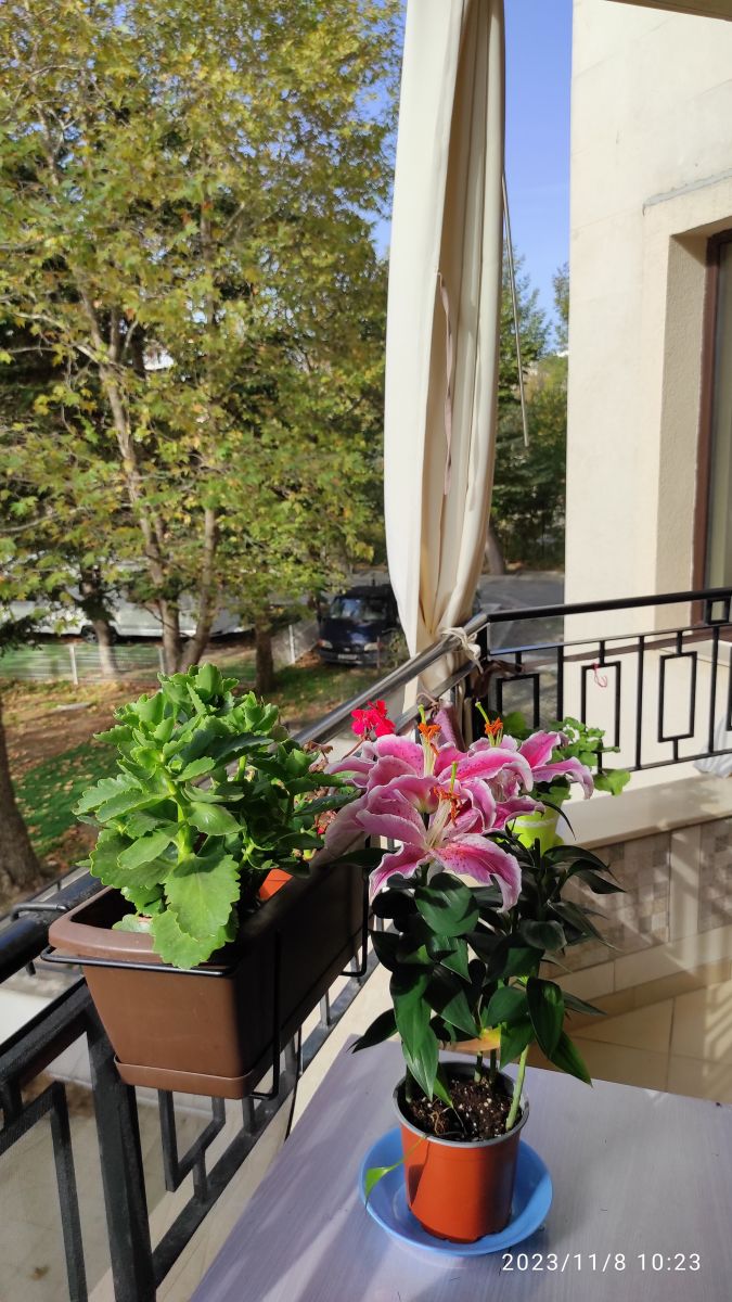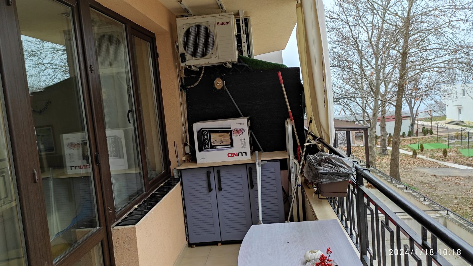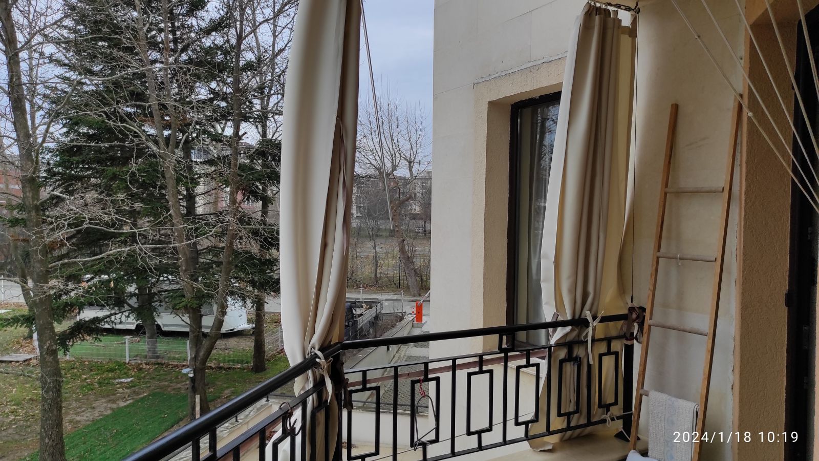 Терасса : Два выхода на терассу - из холла и из спальни. Находится на терассе духовка, мебель стол стулья ,шкаф, выложены стены плиткой. На террасе шторы. Шторы пошиты по заказу из тентовой ткани. Под потолком- подъемная сушка для белья