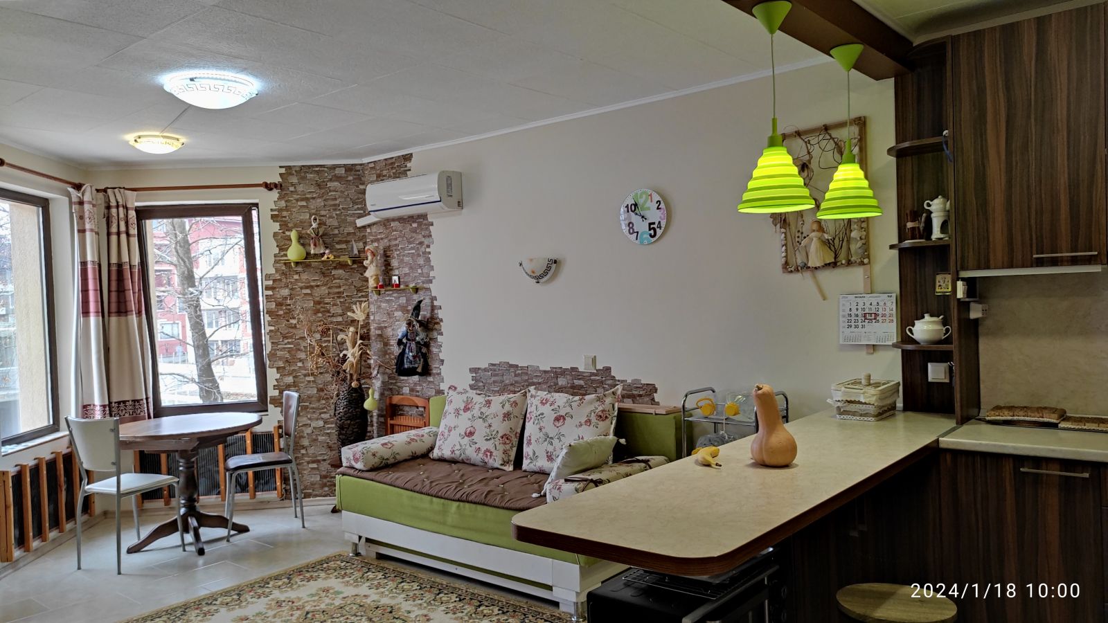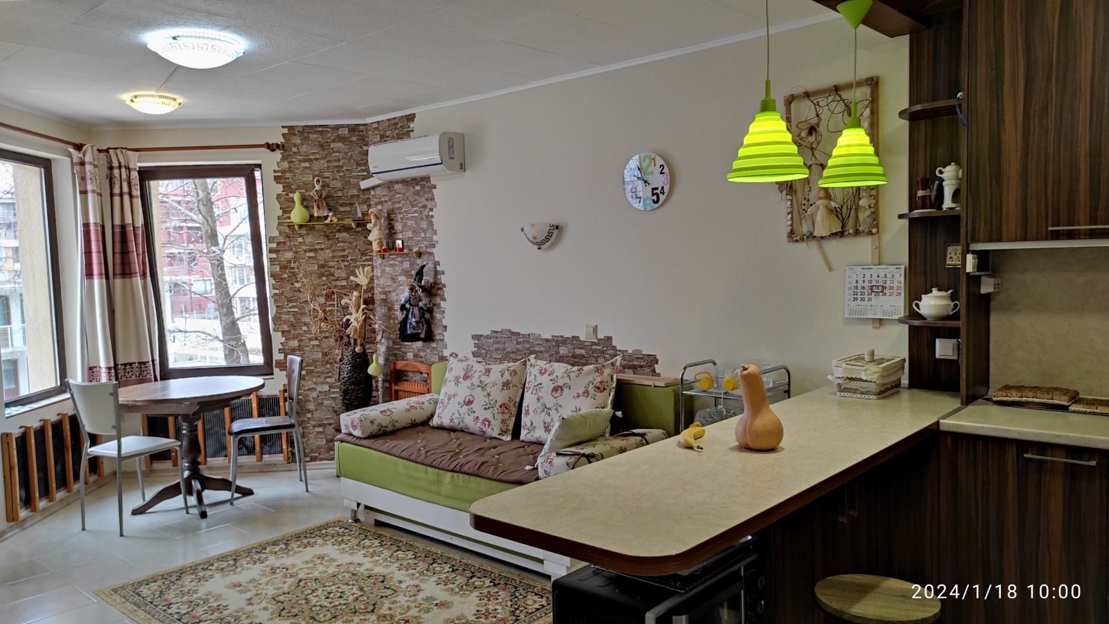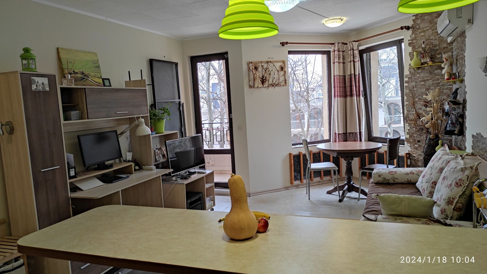 Зал : пол плитка везде, диван раскладной, стол курглый,стулья, рабочий уголок для компьютера, телевизор, шторы,стулья,кресло, кондиционер.